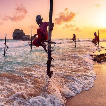 【 Stilt Fishing 高蹺漁夫 】: 海邊潮浪⽣起處,⽔⾯上矗⽴著⼀根根的⽊ 桿,每根⽊桿上還坐著⼀個⼈,⼿拿釣竿⼀下⼀ 下地拉動,這是斯⾥蘭卡獨⼀無⼆的⾵景。 蘭卡最古⽼的釣⿂⽅式! 你也可以親⾝試試!